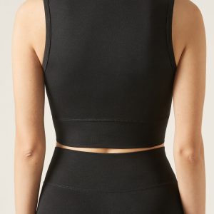 Smooth seamless top with crewneck and wide shoulder straps, featuring an elegant crisscross detail. Pairs with coordinating leggings. This top combines comfort and style, perfect for working out or as part of a casual outfit.