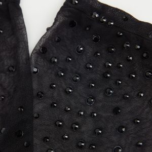 Women’s sheer 10 denier short socks featuring shiny tone-on-tone rhinestone appliqués. Comfortable smooth cuff.