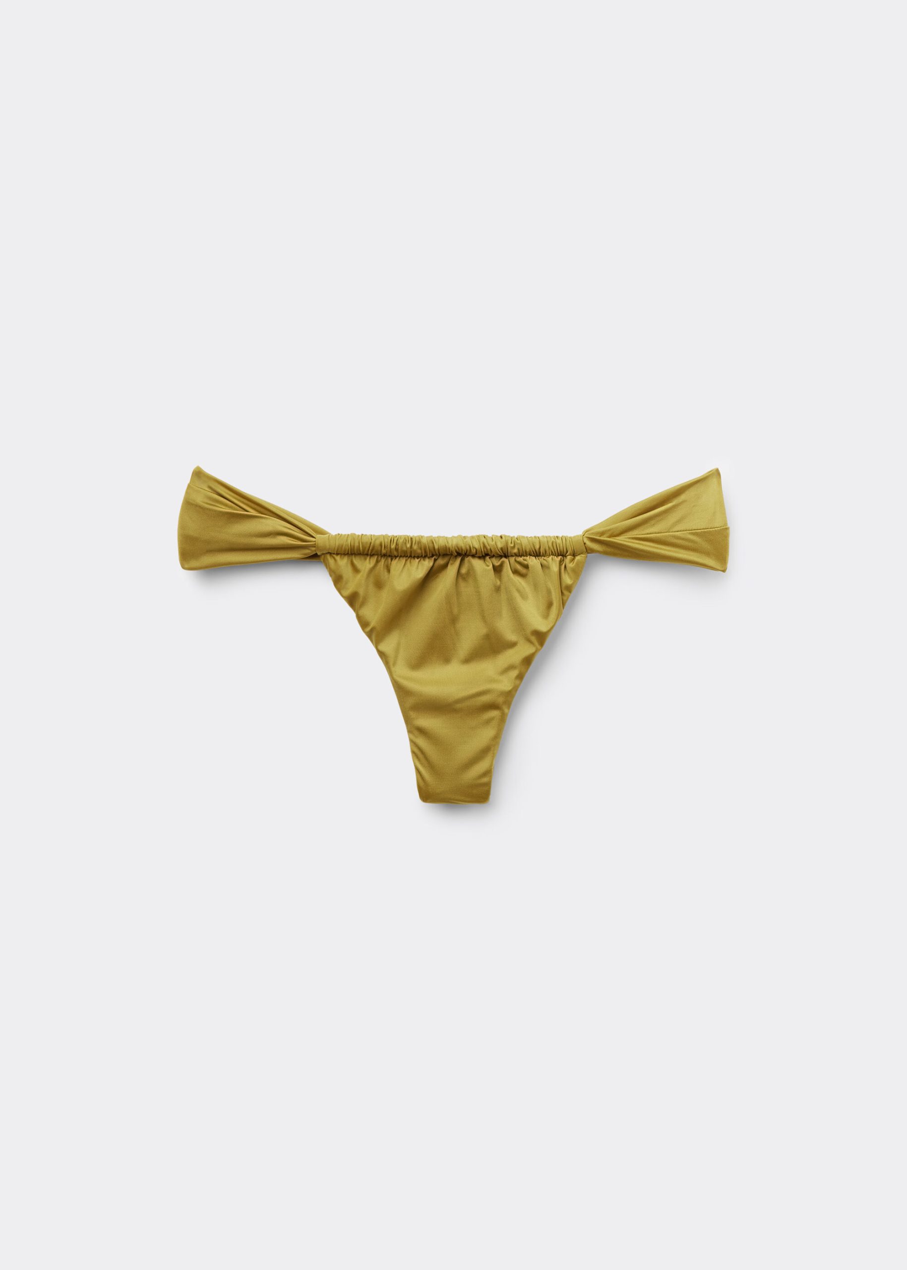 Brazilian bikini bottom with soft sides, featuring a bright fabric with a silky effect with ruffles. Fully lined with invisible seams.