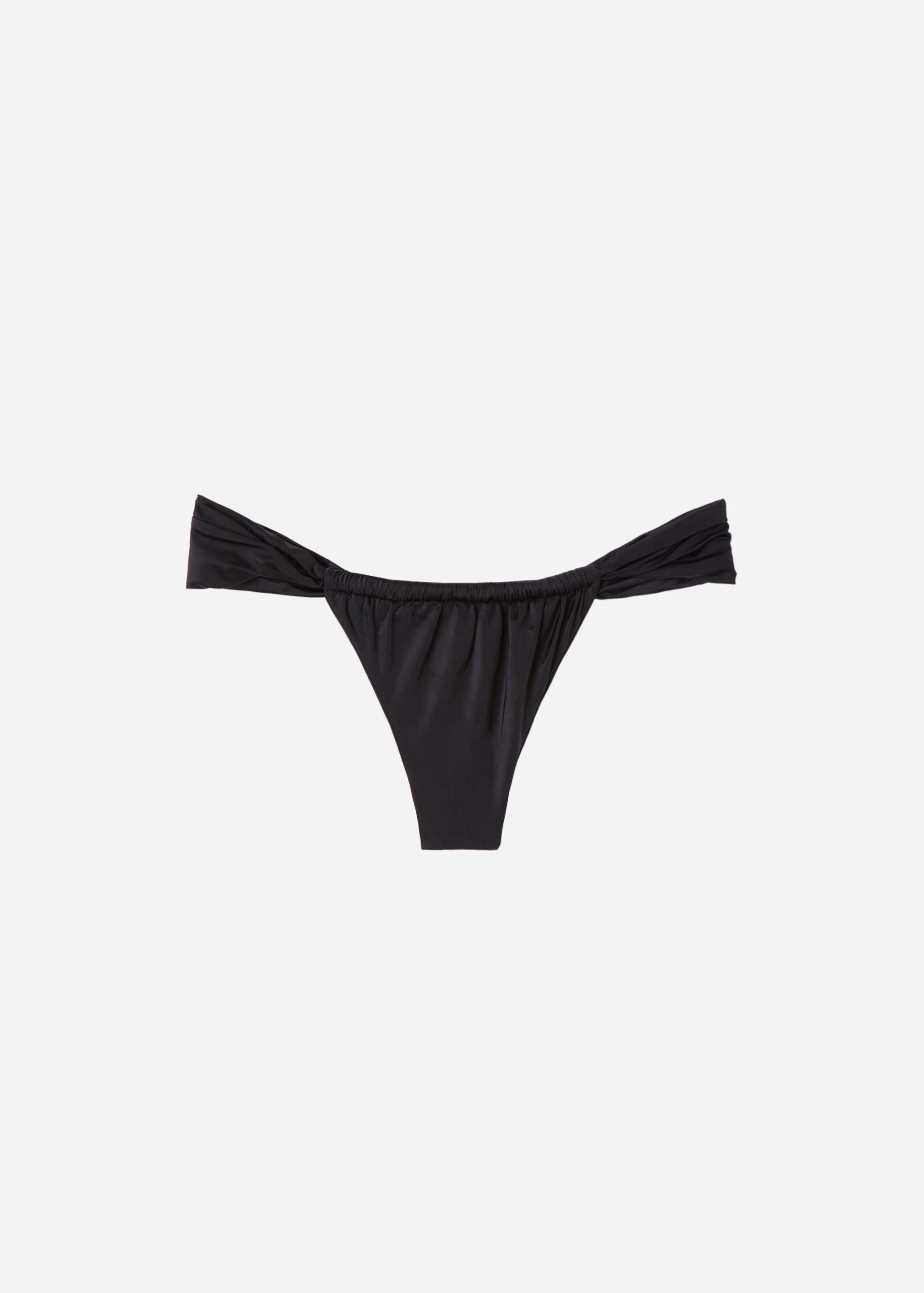 Brazilian bikini bottom with soft sides, featuring a bright fabric with a silky effect with ruffles. Fully lined with invisible seams.