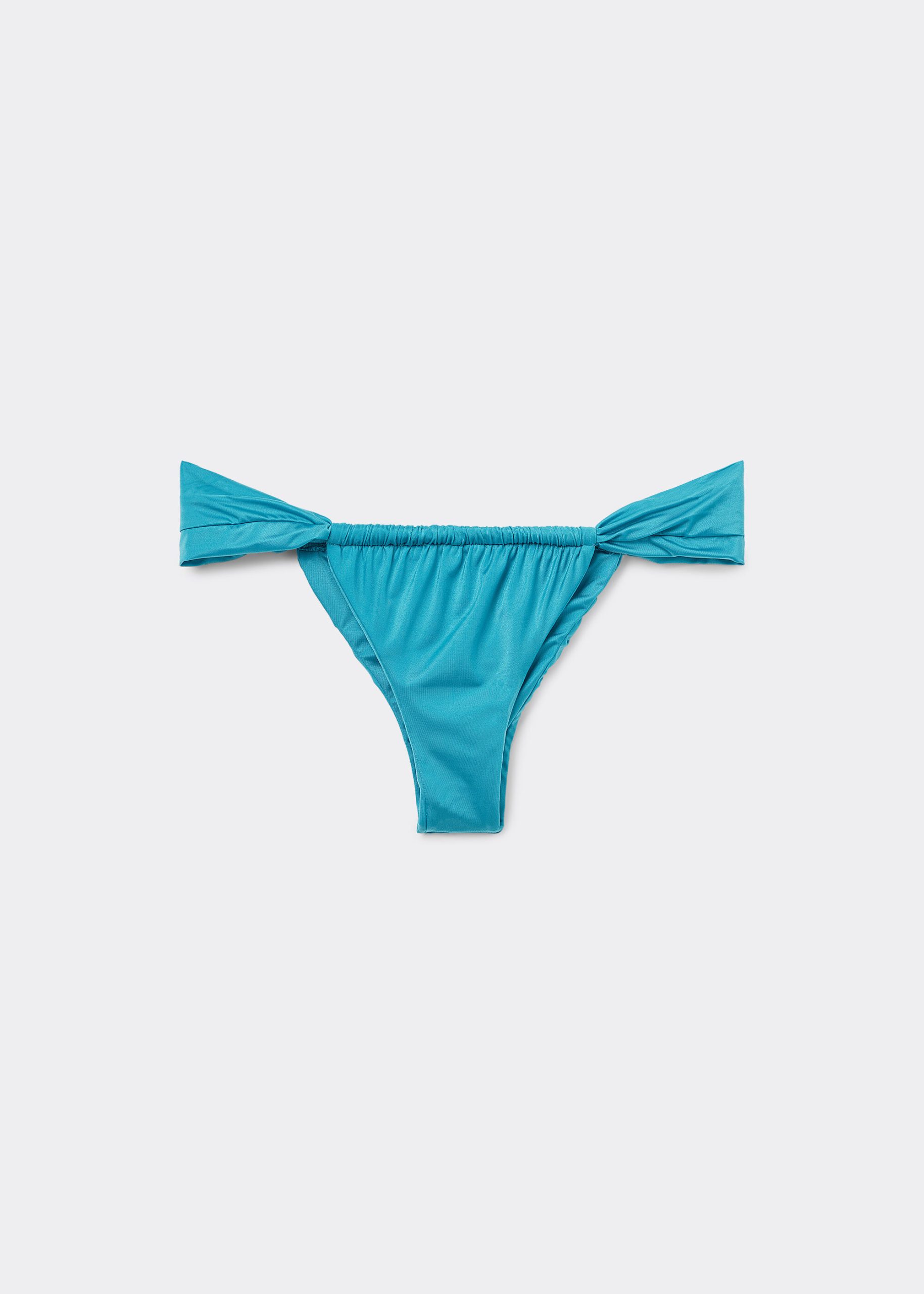 Brazilian bikini bottom with soft sides, featuring a bright fabric with a silky effect with ruffles. Fully lined with invisible seams.