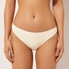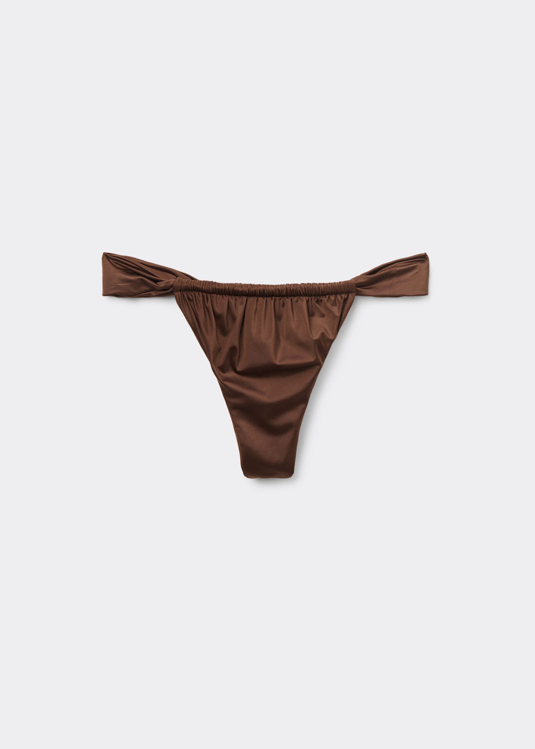 Brazilian bikini bottom with soft sides, featuring a bright fabric with a silky effect with ruffles. Fully lined with invisible seams.