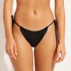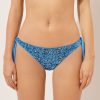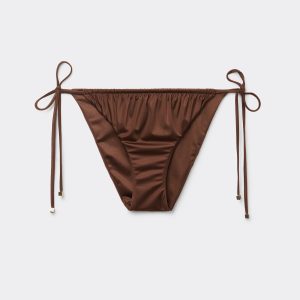 Bikini bottom with side ties to adjust the fit. The style features a bright fabric with a silky effect, embellished by ruffles and gold tips. Fully lined with invisible seams.