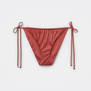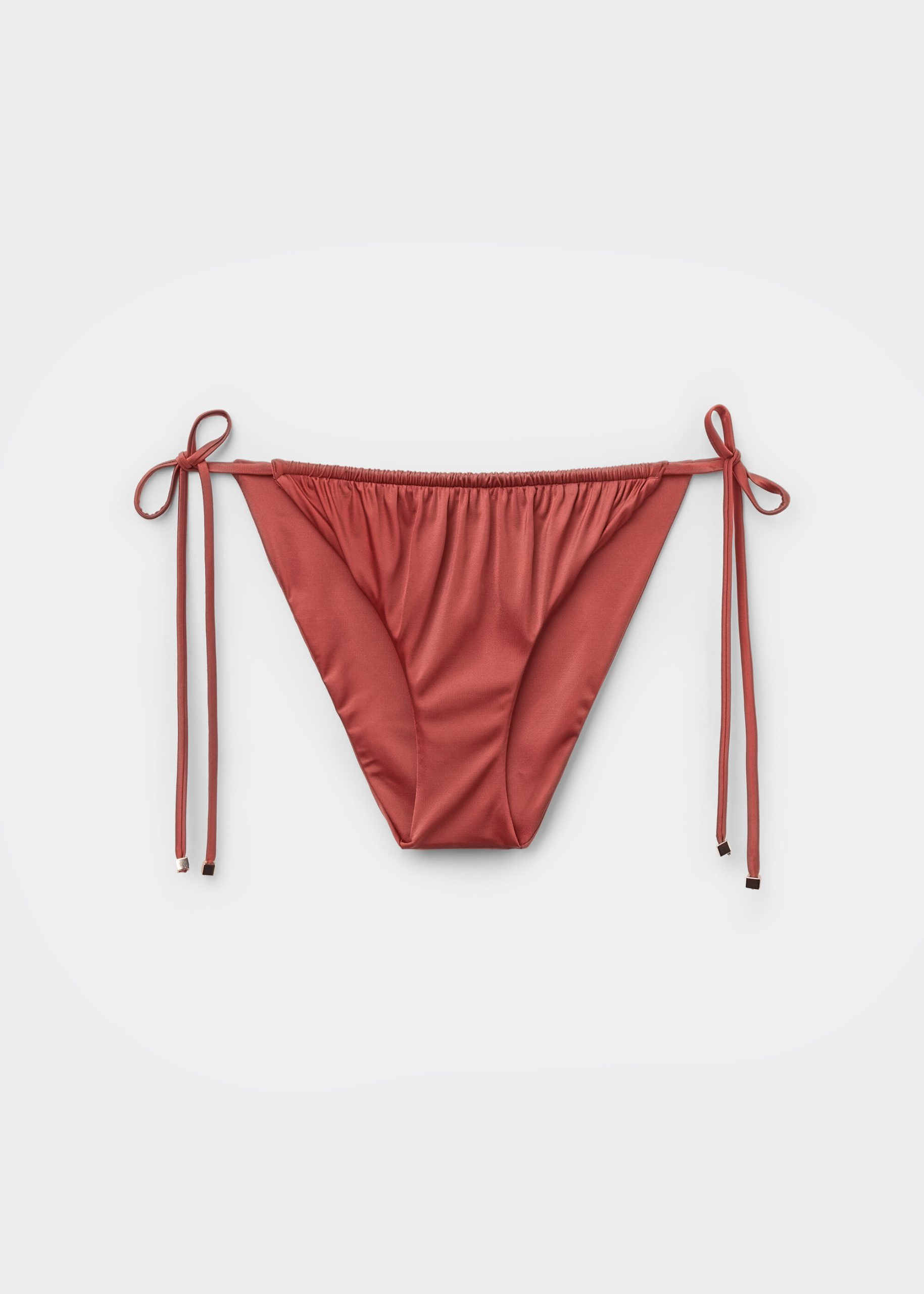 Bikini bottom with side ties to adjust the fit. The style features a bright fabric with a silky effect, embellished by ruffles and gold tips. Fully lined with invisible seams.