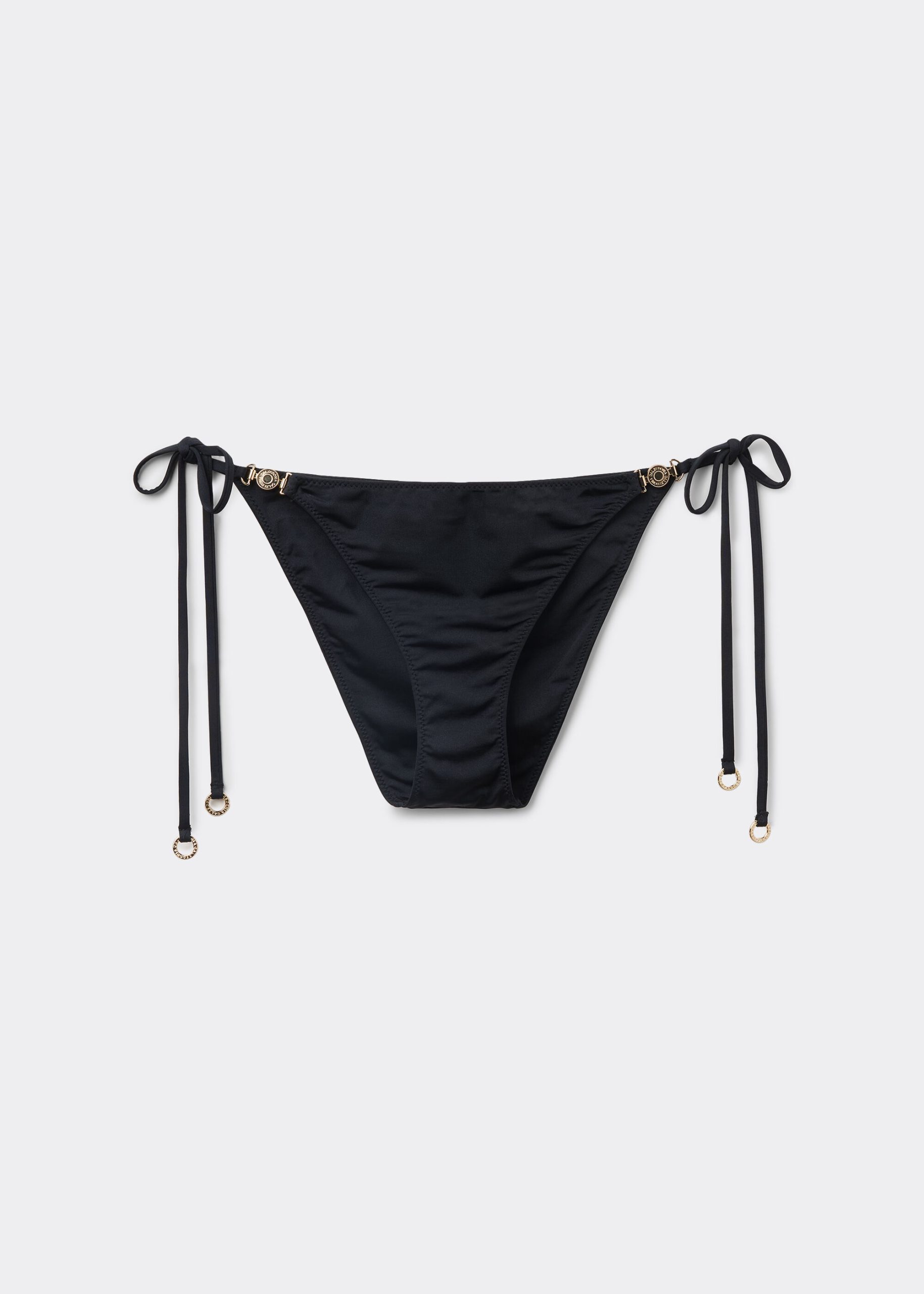 String bikini bottoms with side ties to adjust the fit. The slightly rounded waist at the front allows for both a regular and more high-cut fit, depending on one’s physique. It features a minimal fit that exalts the silhouette with a touch of sensuality and refinement. The bright silk-effect fabric embellished by elegant golden details radiates a sophisticated sensation of discrete luxury.