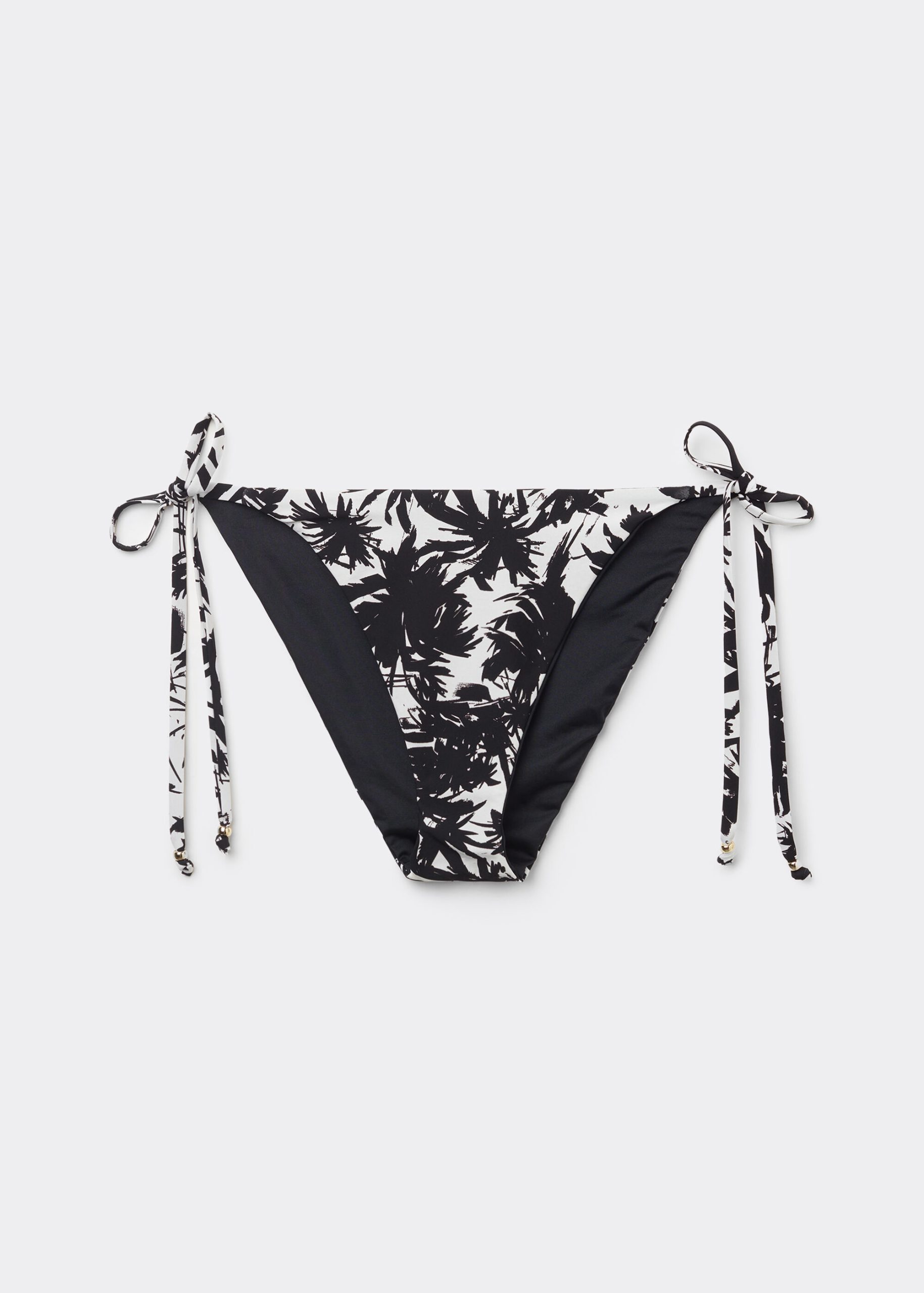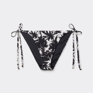 Bikini bottoms with side ties to adjust the fit. The slightly rounded waist at the front allows for both a classic or more high-cut fit, depending on one’s physique. The style features a black and white palm tree patterned fabric. Fully lined and with invisible seams.