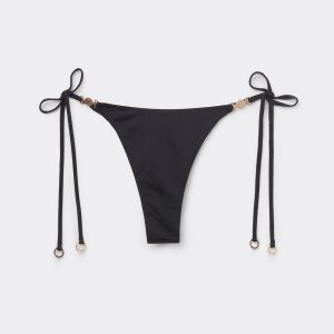Thong bikini bottoms with side string ties to adjust the fit. It features a minimal fit that exalts the silhouette with a touch of sensuality and refinement. The slightly rounded waist at the front allows for both a regular and more high-cut fit, depending on one’s physique. The bright silk-effect fabric embellished by elegant golden details radiates a sophisticated sensation of discrete luxury. Fully lined with invisible seams.