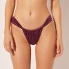 Thong bikini bottoms with side string ties to adjust the fit. It features a minimal fit that exalts the silhouette with a touch of sensuality and refinement. The slightly rounded waist at the front allows for both a regular and more high-cut fit, depending on one’s physique. The bright silk-effect fabric embellished by elegant golden details radiates a sophisticated sensation of discrete luxury. Fully lined with invisible seams.