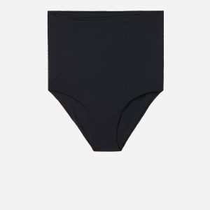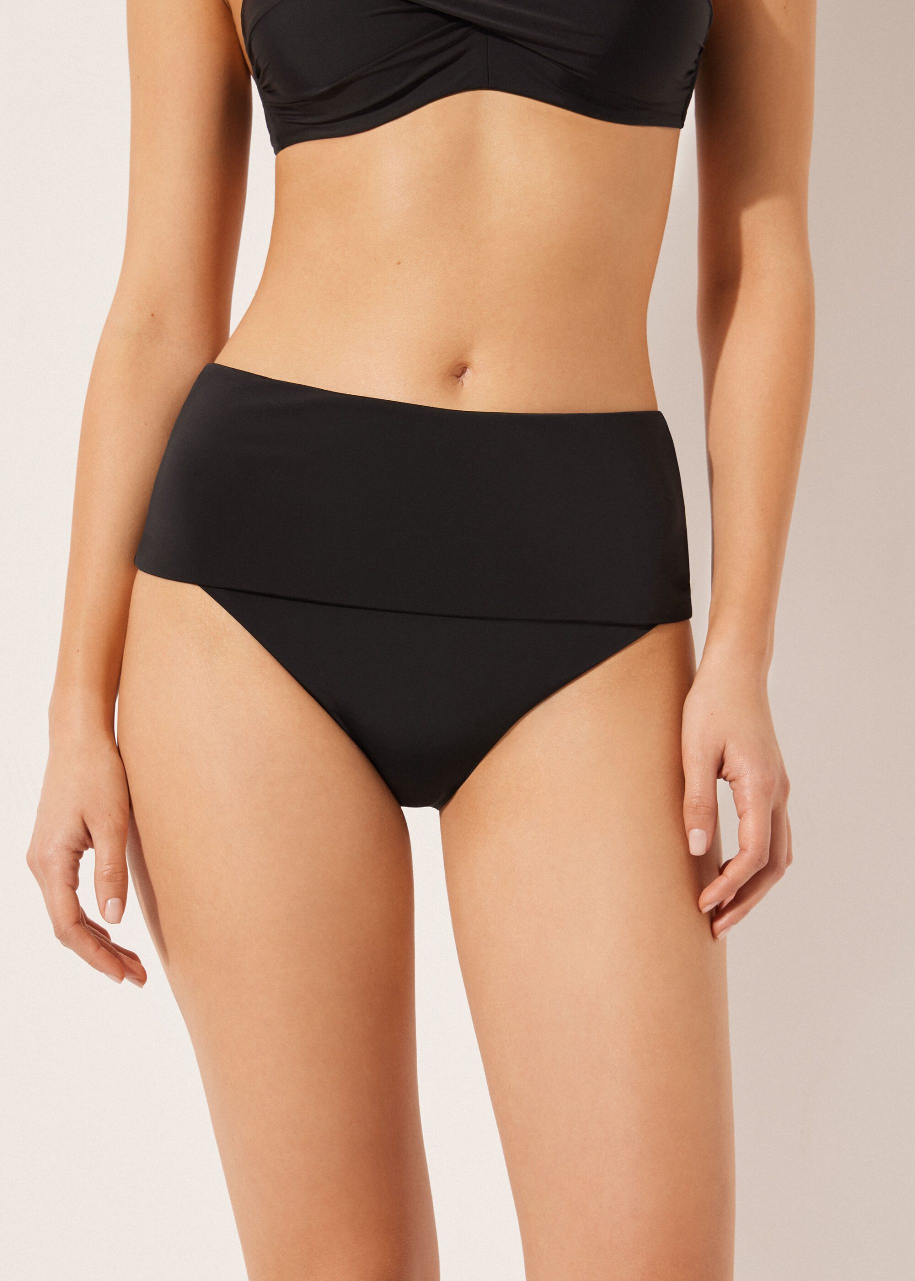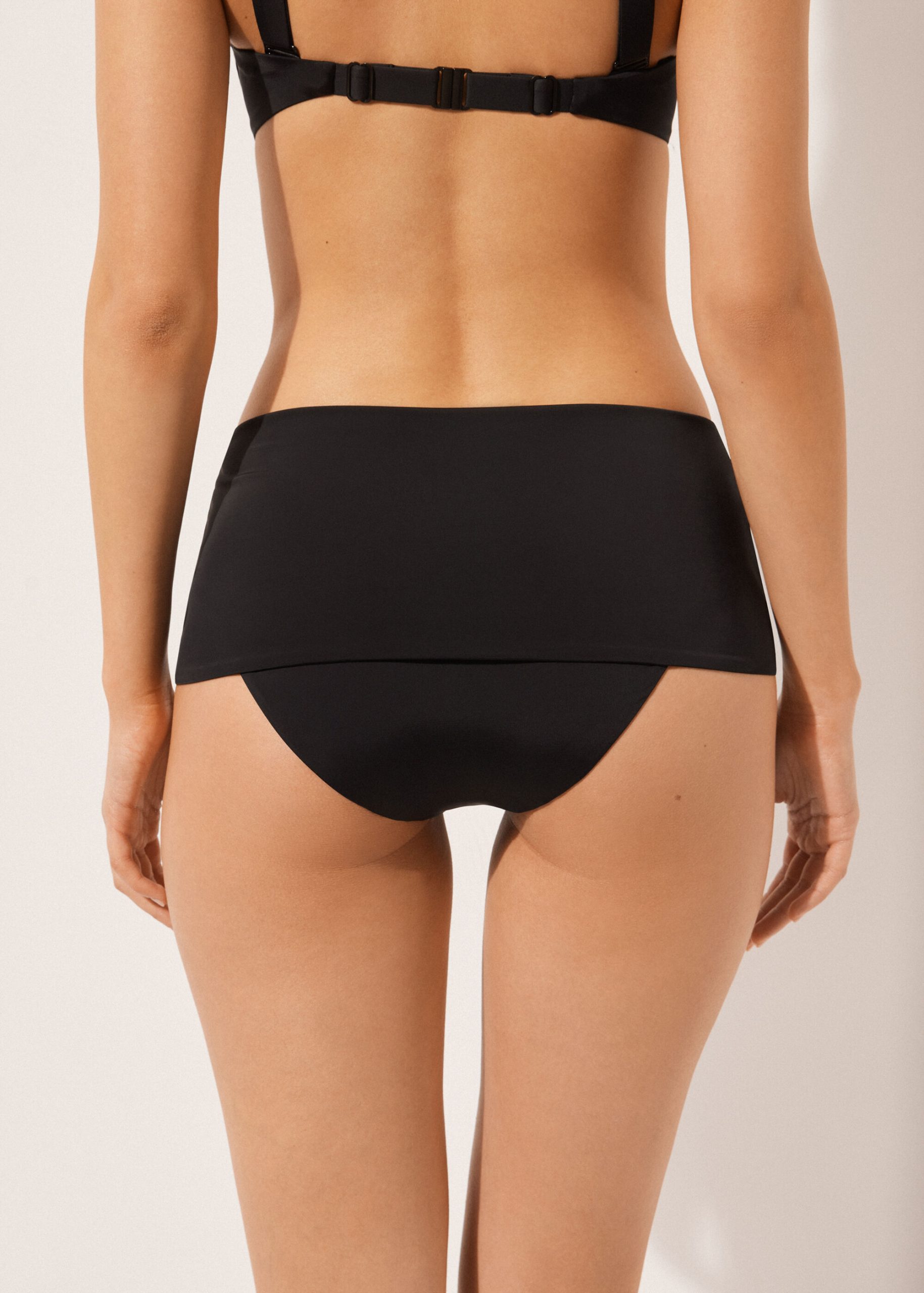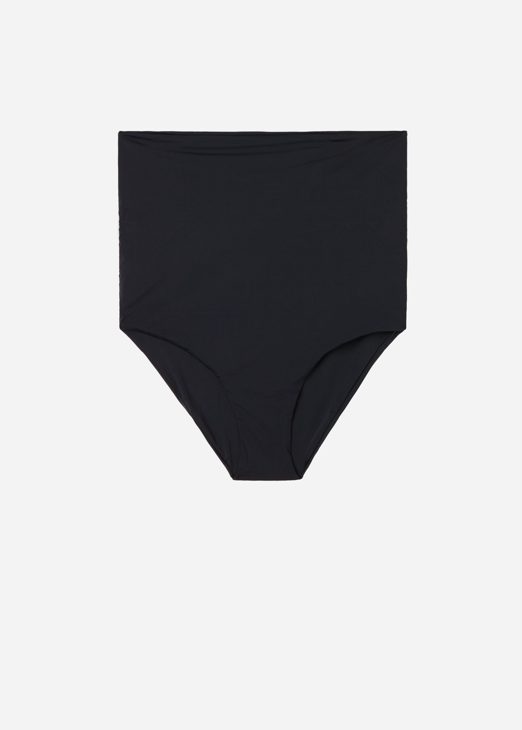Bikini bottom with high band at waist that can be worn to fully cover the mid-section and sides, or folded down to cover the sides and rear. The cut worn high with mid-section coverage is also suitable to be worn as a maternity bikini bottom. The extremely soft fabric makes it pleasant to wear, offering a light and comfortable feel on the skin. Fully lined and with invisible seams.