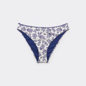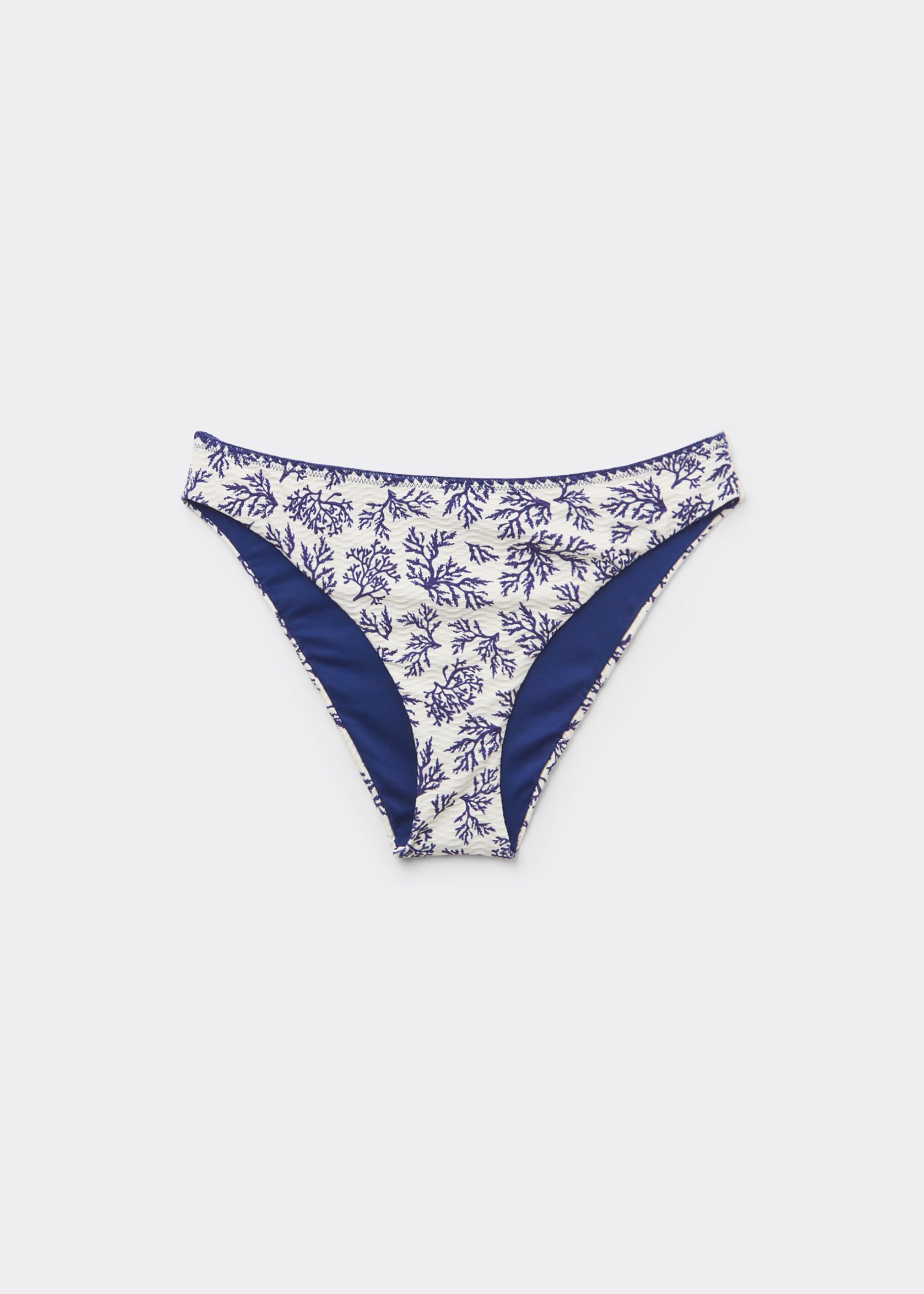Fully lined bikini bottoms with invisible seams in order to not leave marks. The rounded waist at the front allows for both a classic or more high-cut fit, depending on one’s physique. A marine blue coral print on slightly crinkled fabric, which creates a fresh, refined and dynamic effect.