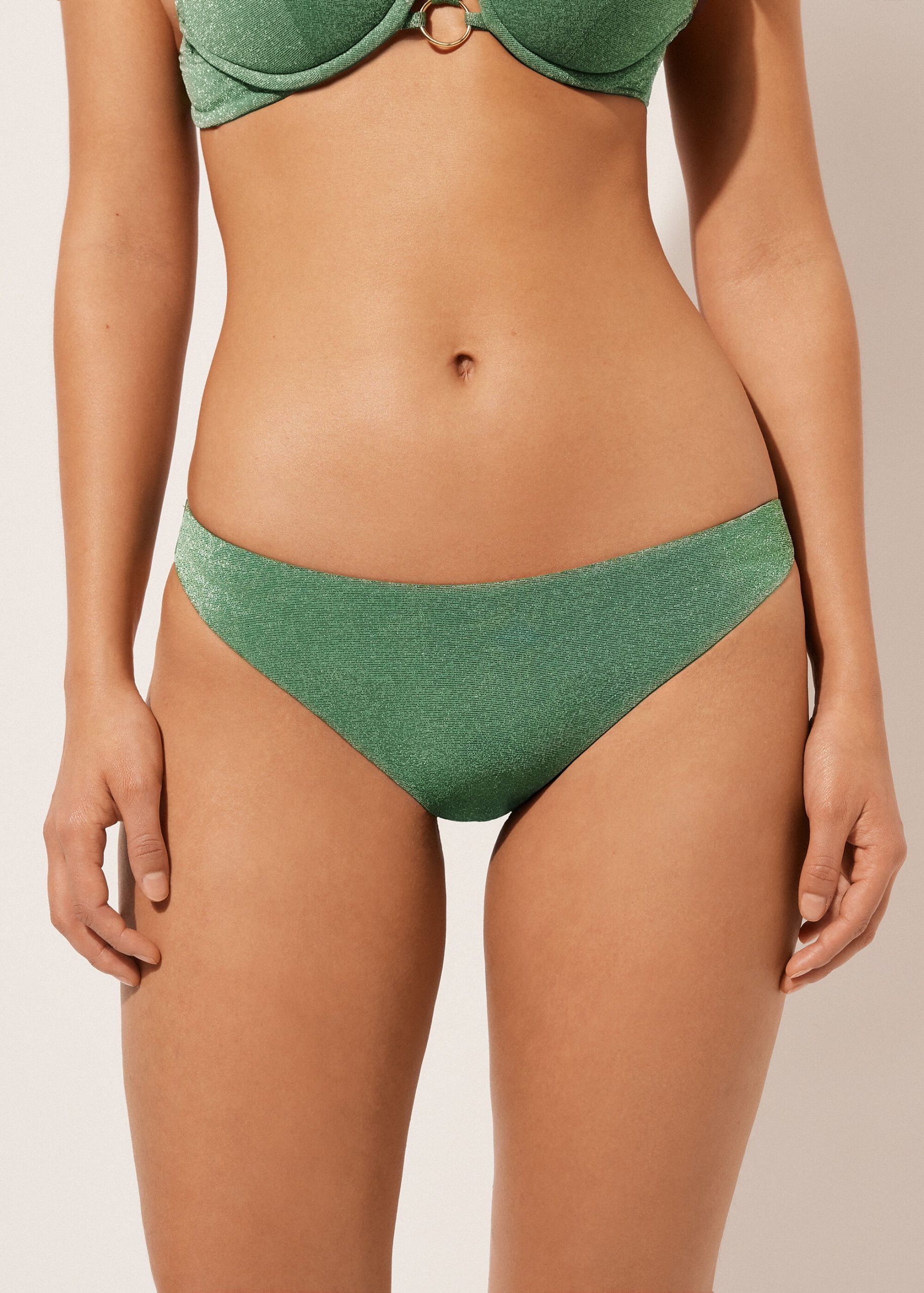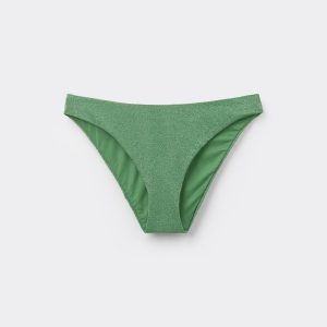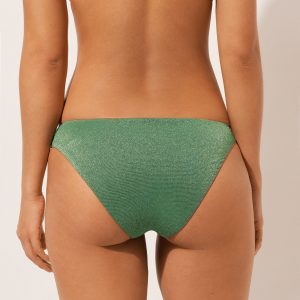 Fully lined bikini bottoms. The slightly rounded waist at the front allows for both a classic or more high-cut fit, depending on one’s physique. Soft fabric with shiny lamé thread.