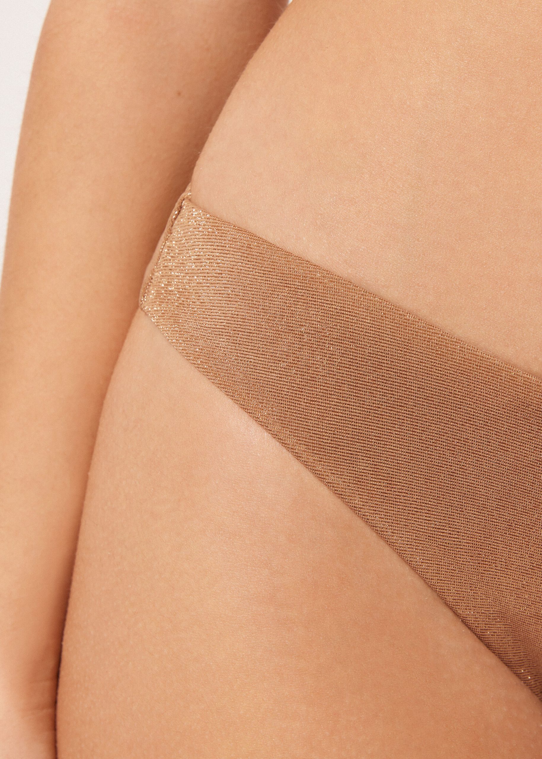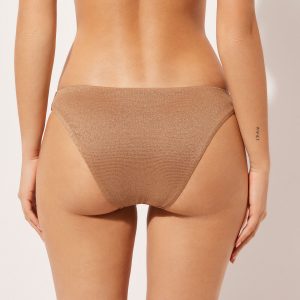 Fully lined bikini bottoms. The slightly rounded waist at the front allows for both a classic or more high-cut fit, depending on one’s physique. Soft fabric with shiny lamé thread.