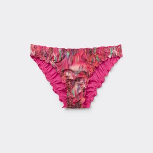 Fully lined bikini bottoms with invisible seams in order to not leave marks. The rounded waist at the front allows for both a classic or more high-cut fit, depending on one’s physique. Pattern illuminated by sparkling glitter, with vibrant patterns in a mix of warm and bright tones. Reminiscent of a refined ethnic style.