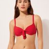 Wireless tank-style bikini top with lightly padded cups. The side boning helps support the bust. The style features a crinkle fabric embellished with contrast color embroidery. Adjustable straps and thin tie closure on the back.