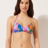 Wireless single strap bikini top with light padding that softly shapes the bust. The 3D crinkled fabric, enriched by a braided string, provides a touch of sophisticated elegance. The side boning ensures excellent support, while the string tie fastening at the back completes the design for this distinctive, modern and feminine summer look.