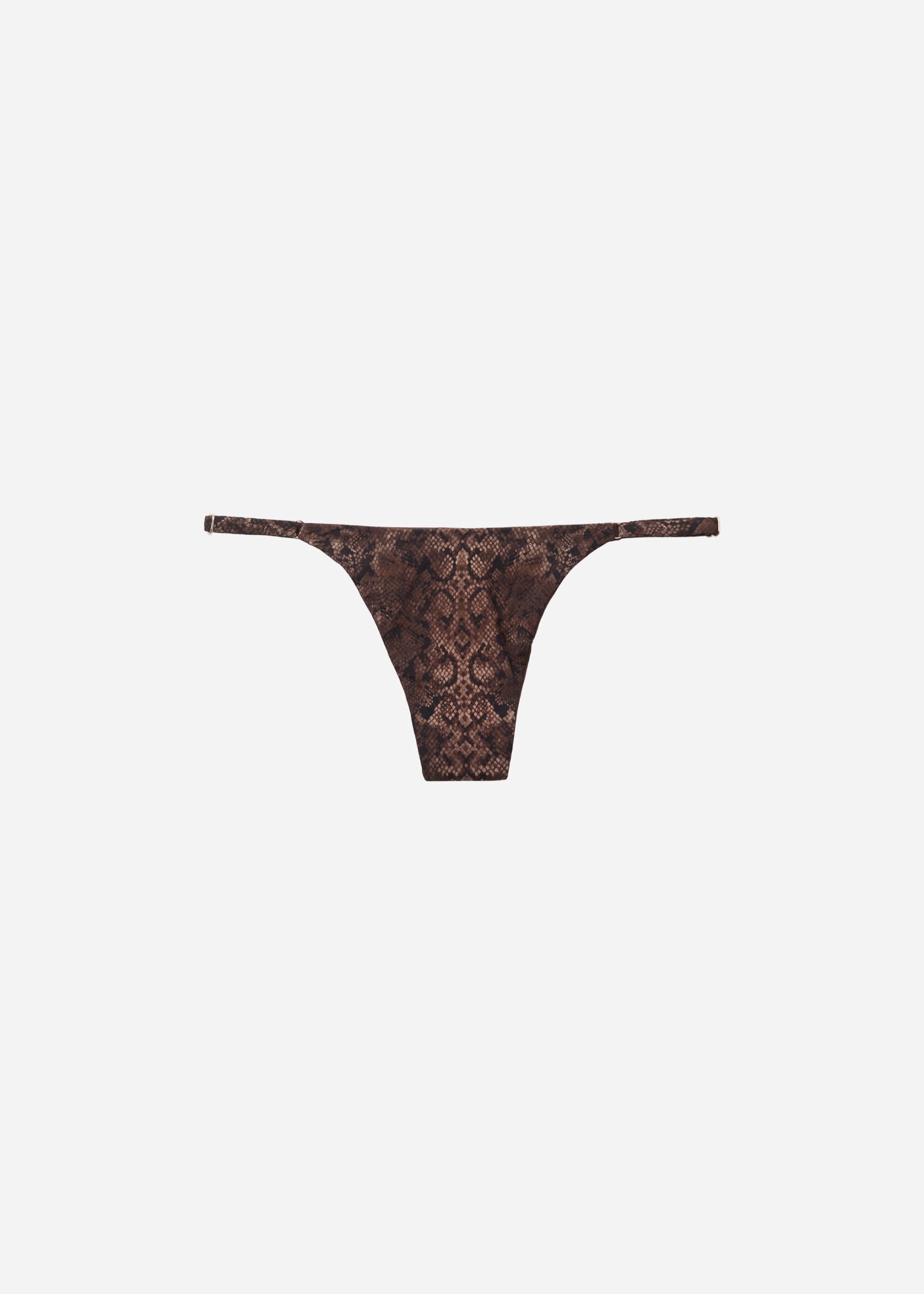 Thong bikini bottoms with adjustable thin sides. The slightly rounded front allows for wearing it either as normal or with the legs higher on the sides to show off the physique. The style features a sophisticated dark brown animal pattern embellished with small nickel-free rings. Fully lined with invisible seams.