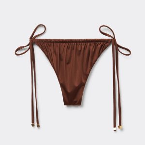 Thong bikini bottoms with adjustable thin sides. The slightly rounded front allows for wearing it either as normal or with the legs higher on the sides to show off the physique. Fully lined with invisible seams.