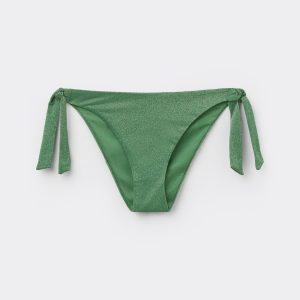 Bikini bottom with side tie closure to adjust the fit. Soft fabric with shiny lamé thread. Fully lined.