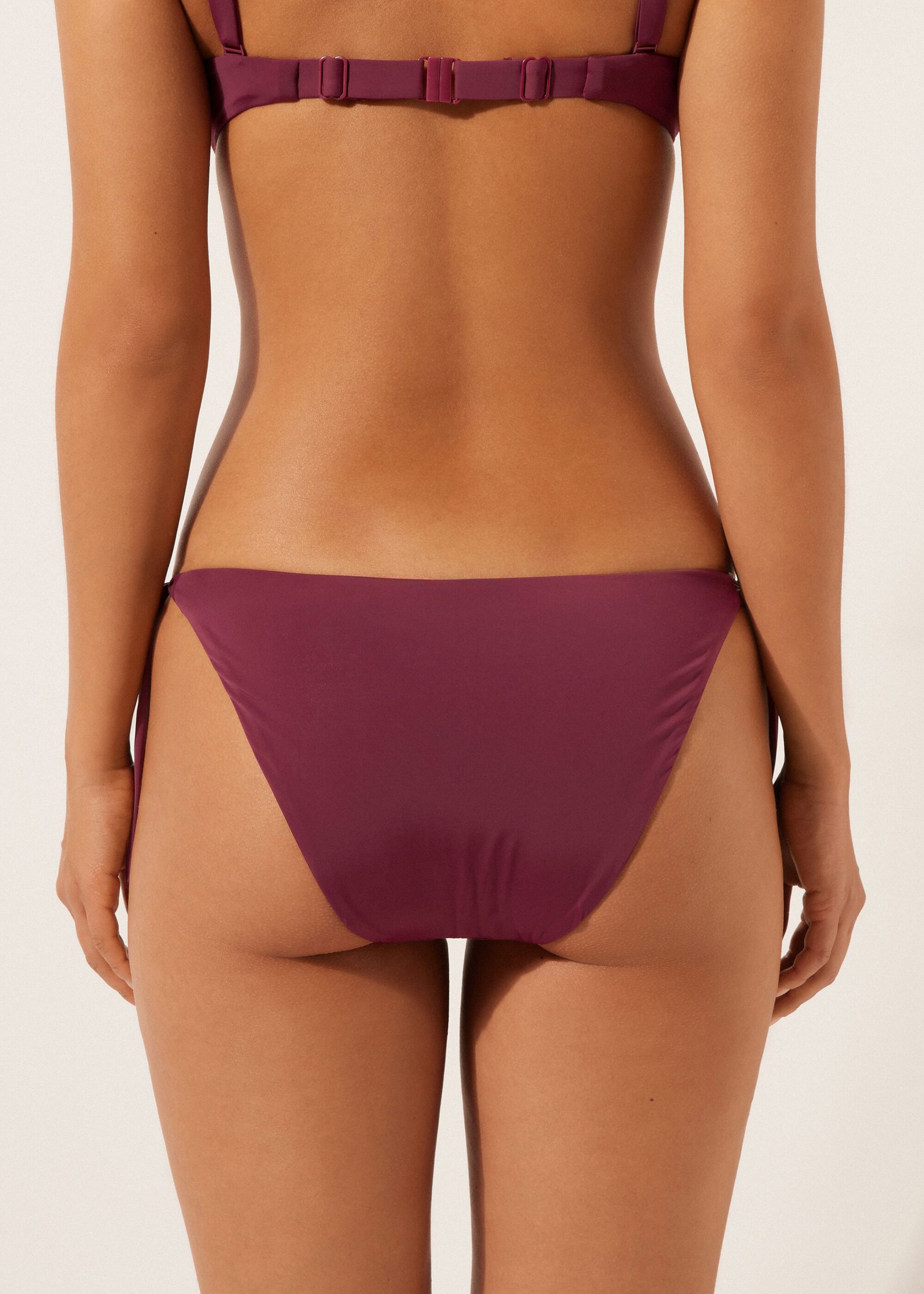 Bikini bottom with side tie closure to adjust the fit. The slightly rounded waist at the front allows it to be worn either in a classic style or a more high-cut fit, depending on one’s physique. The extremely soft fabric makes it pleasant to wear, offering a light and comfortable feel on the skin. Fully lined with invisible seams.