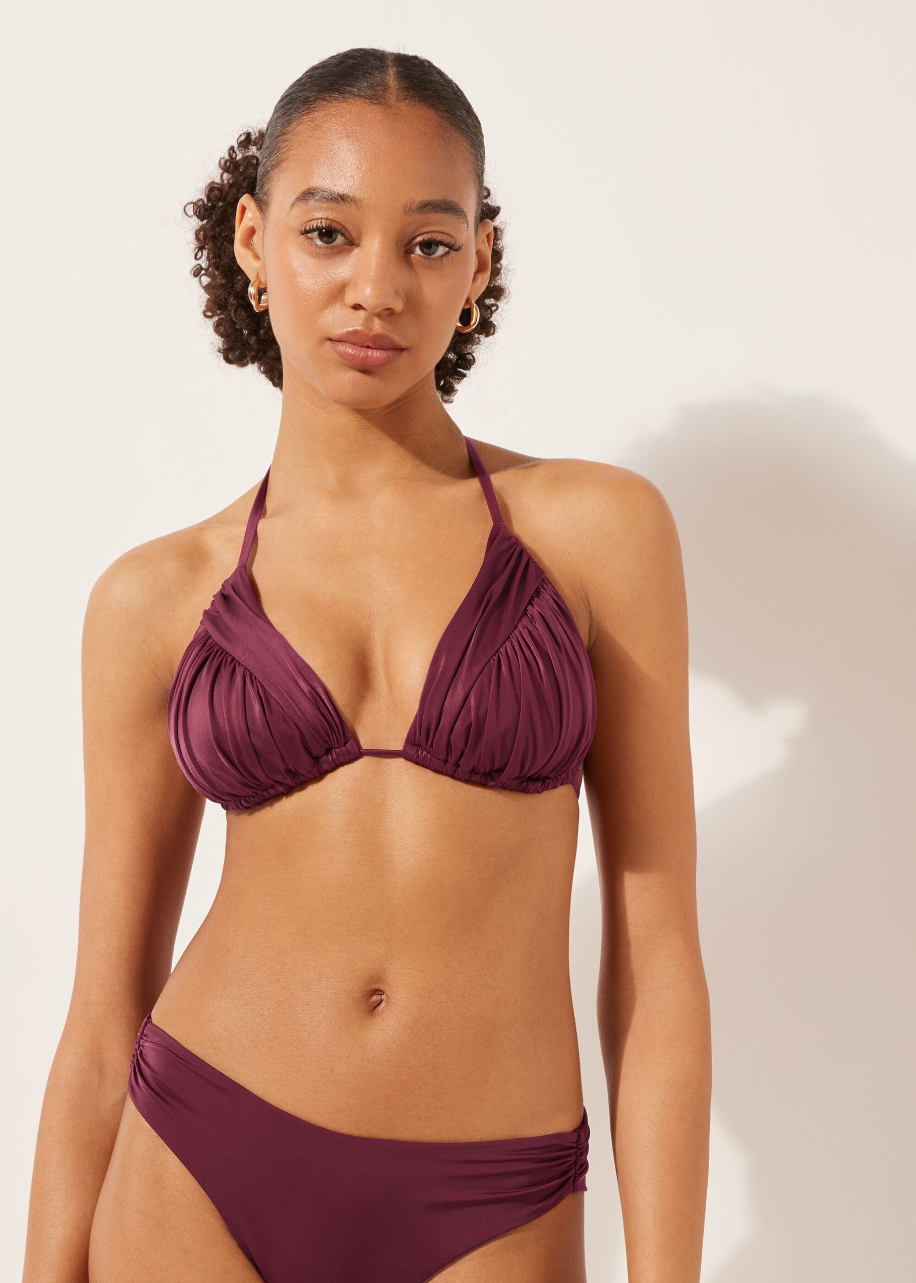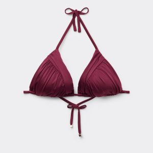 Wireless slide triangle bikini top with cups with removable padding. The style features bright fabric and ruching on the cups. The shoulder straps have eyelets on the ends so they can be hooked onto the back band or tied behind the neck. Back string tie closure.