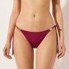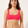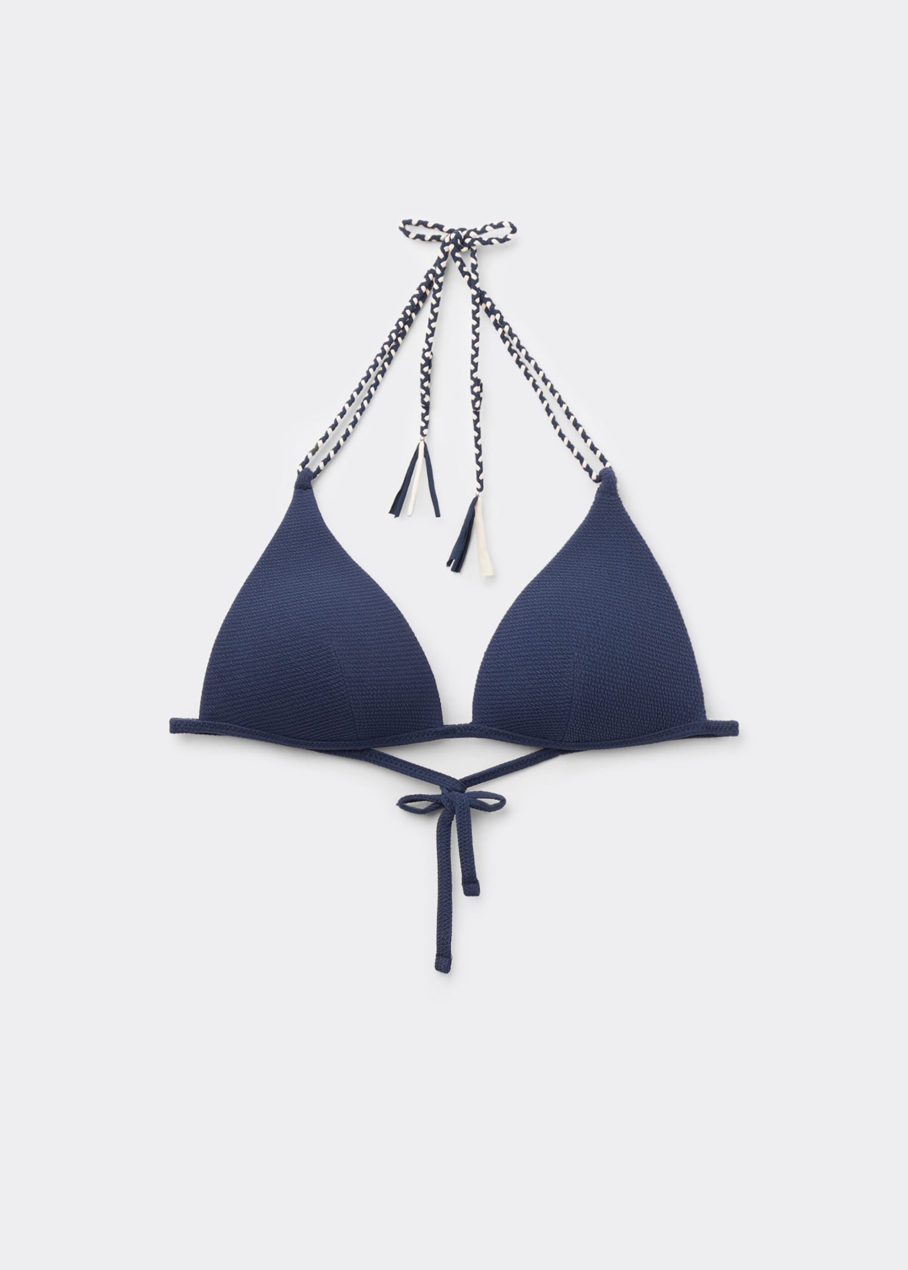 Fixed triangle bikini top with no underwire and with graduated padded cups that add volume to enhance the décolleté. The style is defined by a three-dimensional monochrome fabric with a slightly crinkled texture that adds depth and sophistication. The shoulder straps feature a two-toned braid. Back string tie closure.