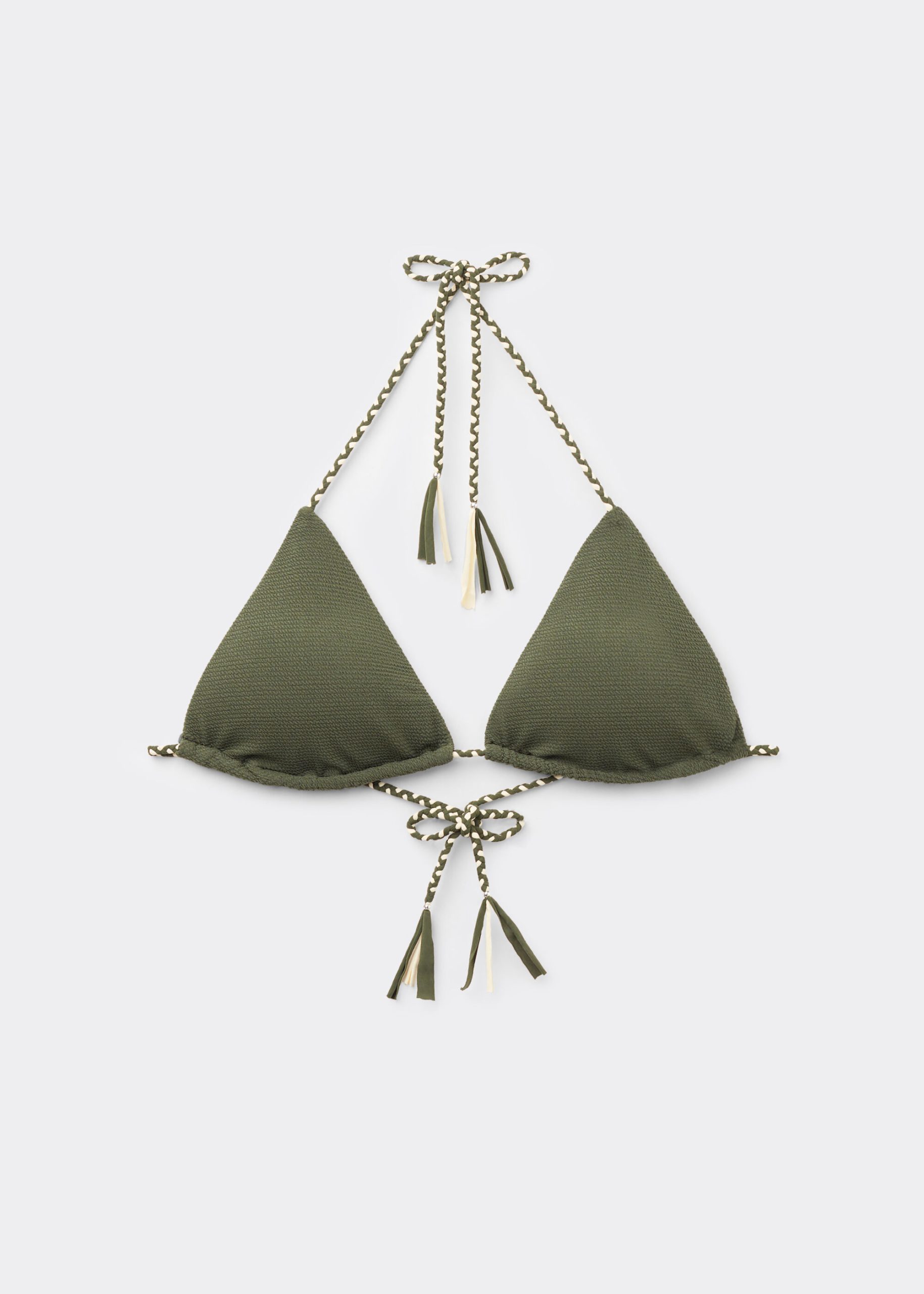 Slide triangle bikini top with removable padding, wireless for a natural effect. The 3D crinkled fabric, enriched by a braided string, provides a touch of sophisticated elegance. The shoulder straps have eyelets on the ends so they can be hooked onto the back band or tied behind the neck. Back string tie closure.