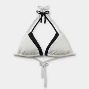 Triangle string bikini top with removable padding, wireless. Featuring a refined design, it stands out due to the elegant layering effect of the double black and white two-tone shoulder straps that can be fastened in two different ways, adding a touch of fashion and sophistication. Back string tie closure.