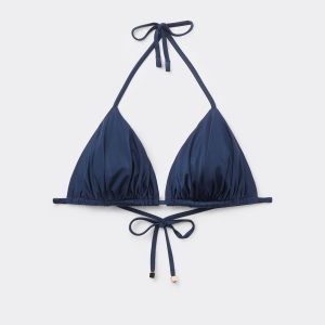 Wireless triangle bikini top with removable padding. The style features a particularly soft and comfortable bright fabric with a silky effect. The shoulder straps have eyelets on the ends so they can be hooked onto the back band or tied behind the neck. Back string tie closure.