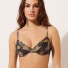 Slide triangle bikini top with removable padding and no underwire for a natural effect. The style features a particularly soft three-dimensional diagonal-motif fabric. The shoulder straps have eyelets on the ends so they can be hooked onto the back band or tied behind the neck. Back string tie closure embellished with silver tips.
